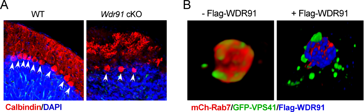 A. Wdr91神经元特异敲除的小鼠浦肯野细胞数量显著降低; B. WDR91抑制Rab7对VPS41的招募。