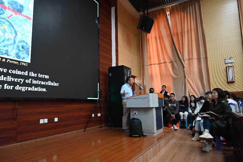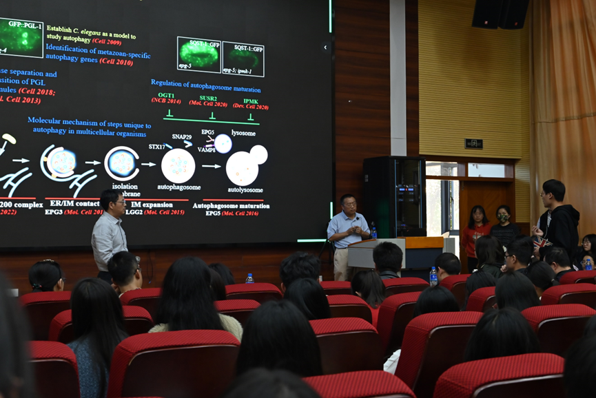 此次的报告,张宏研究员系统讲解了什么是自噬、多细胞生物自噬与酵母自噬的不同、自噬小体成熟降解的过程和他们的一些最新发现,包括通过遗传筛选获得的参与自噬小体形成和成熟的关键蛋白的分子生物学功能,以及它们在相关疾病和新冠肺炎病毒感染中的作用。其中,内质网上的Ca2+瞬变对多细胞生物自噬与疾病的关系引发了在场老师和同学的强烈兴趣。