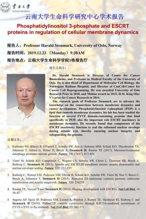 云南老员工命科学中心学术报告—Professor Harald Stenmark, University of Oslo“Phosphatidylinositol 3-phosphate and ESCRT proteins in regulation of cellular membrane dynamics”
