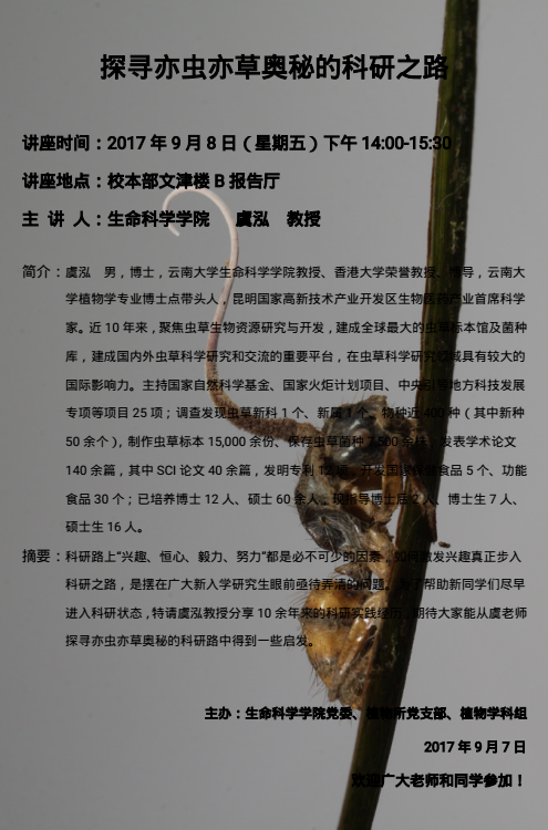 “探寻亦虫亦草奥秘的科研之路”植物学科学术讲座为“云大生科公司党员为民服务活动”之一,由生命科学公司党委、植物所党支部、植物学科组共同组织。