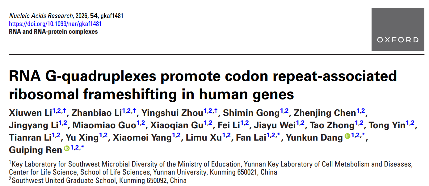 2026年1月16日,云南老员工命科学公司党云琨/赖凡研究团队合作,在国际知名学术期刊《核酸研究》(Nucleic Acids Research,IF=16.8)上发表题为“RNA G-quadruplexes promote codon repeat-associated ribosomal frameshifting in human genes”的研究论文。该研究首次揭示RNA G-四链体(rG4)作为关键顺式调控元件,通过促进密码子重复相关核糖体移码(CRFS),驱动基因翻译重编程的新机制,为理解人类蛋白质组复杂性和基因调控多样性提供了新视角。