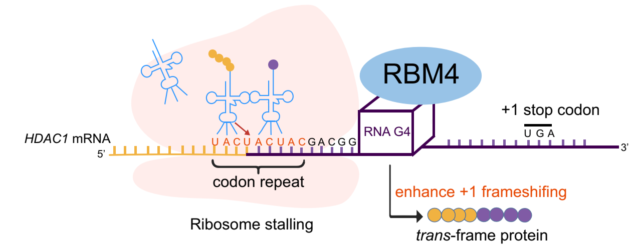 为解析该机制,研究团队通过CRISPR筛选技术发现RNA结合蛋白RBM4对HDAC1移码效率具有关键调控作用。进一步实验表明,RBM4通过识别并结合密码子重复序列下游的rG4结构,显著促进HDAC1移码频率,且该机制具有普适性——多个经典rG4序列均可高效促进CRFS事件。