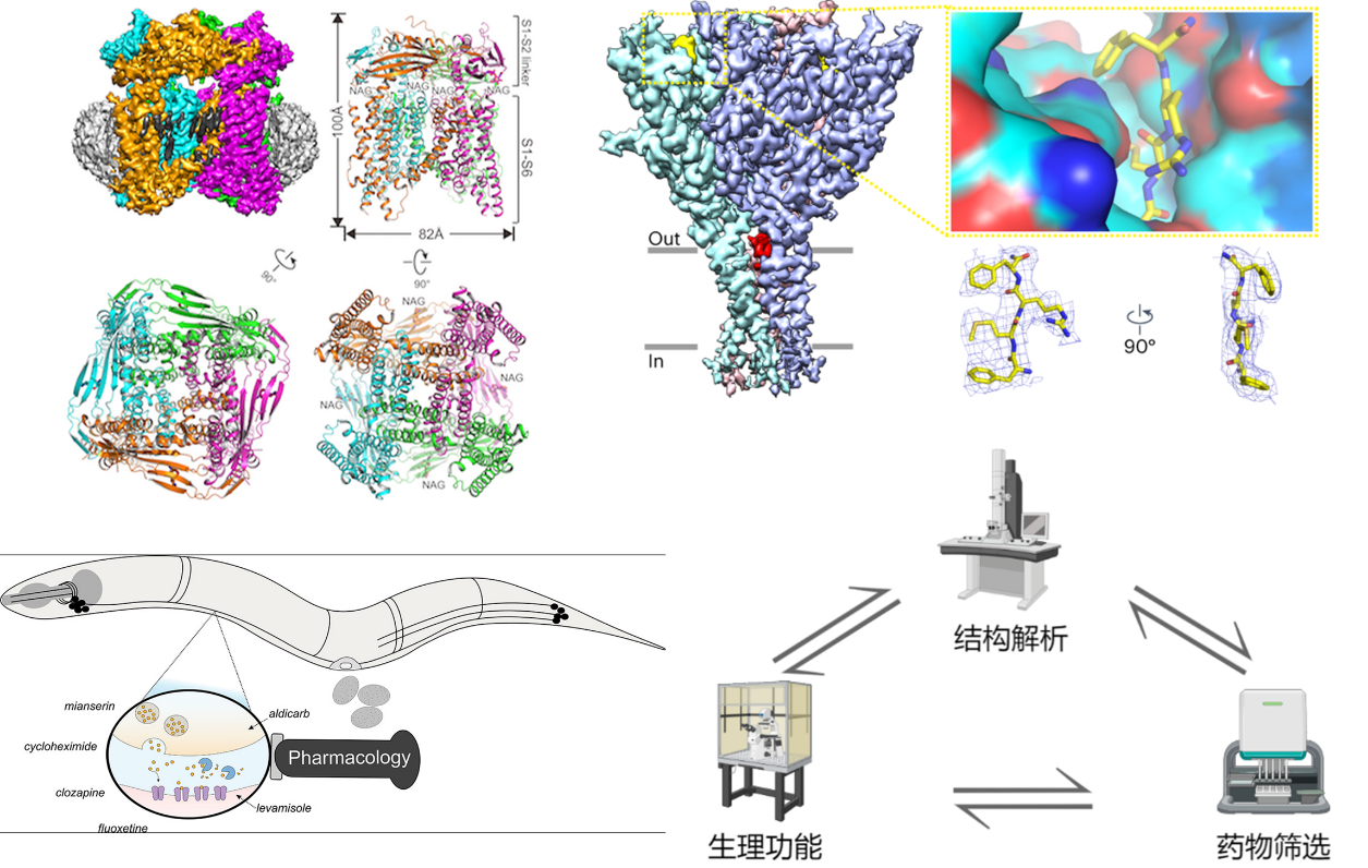 本课题组以X射线晶体学/单颗粒冷冻电镜等结构生物学手段为基础,结合电生理技术和计算生物学等方法,在同一健康(One health)理念的指导下,开展跨膜蛋白质机器的结构和功能研究,特别是人兽共患寄生线虫中的离子通道类药靶,以及与人类疾病密切相关的离子通道/离子转运蛋白等,并基于这些靶标开展药物设计和筛选。本课题组主要研究方向包括: